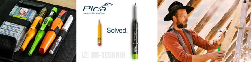 Inovatívne priemyselné značkovače novej generácie od nemeckého výrobcu Pica-Marker. BB-TECHNIK je distribútor značkovačov PICA pre Slovenskú republiku. V ponuke značkovačov nájdete automatické ceruzy Pica-Dry a Pica BIG Dry, značkovač do hlbokých dier Pica-Ink, voskové značkovače Pica VISOR, kvalitné ceruzy rady Pica Classic Line, kvalitné fixky Pica Permanent Marker, kvalitné priemyselné kriedy, priemyselné lakové značkovače Pica Industry paint marker a mnohé iné.