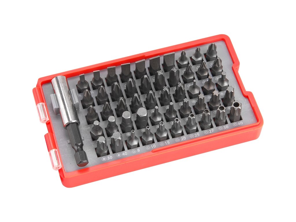 EXTOL 51-dielna sada bitov s magnetickým nadstavcom. Obsah sady: (-)3-4-5-5,5-6-6,5-7mm, (+)PH0-1-2-3, PZ0-1-2-3,(HEX)1,5-2-2,5-3-4-5-6mm, (TORX)T8-10-15-20-25-27-30-40, s dierkou T8-10-15-20-25-27-30-40, TORX s dierkou 8-10-15-20-25-27-30-40, magnetický nadstavec 60mm. Plastové púzdro s klipom pre zavesenie na opasok.