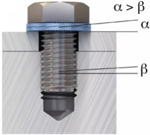 - Po dotiahnutí skrutky sa vonkajšie ozubenie zatlačí do spájaného materiálu podložky a zuby sa zahryznú do kontaktnej plochy a do plochy skrutky. Uhol protichodných klinov α, na vnútorných stranách podložiek je väčší ako stúpanie závitu β, tým je vytvorený klinový aretačný efekt, ktorý zabraňuje uvoľneniu skrutky aj za najťažších podmienok.