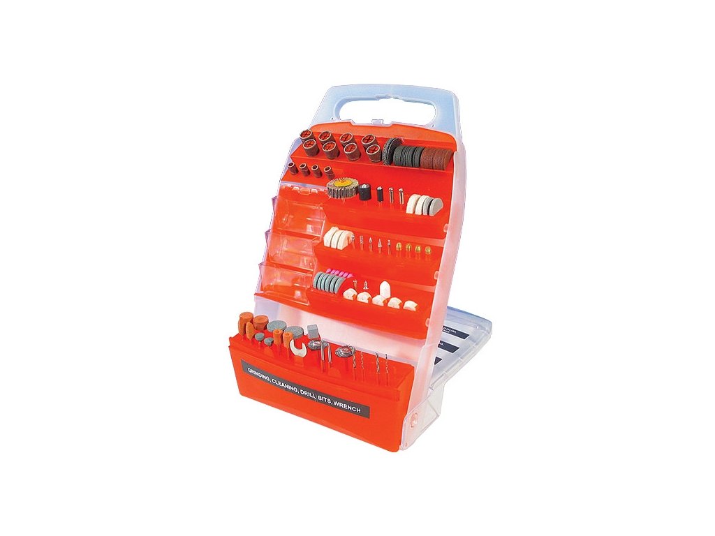 Široká sada rôznych brúsnych, leštiacich a rezacích nadstavcov pre priame brúsky, 150-dielna sada, stopka pr.3mm, plastový stojan.
