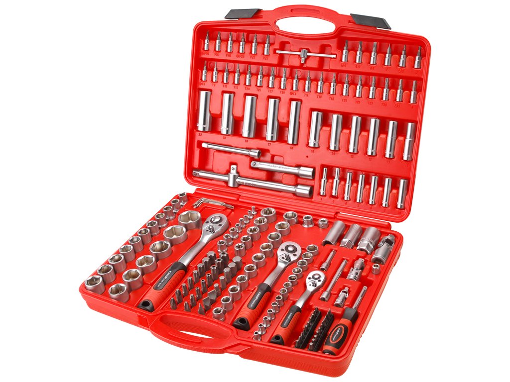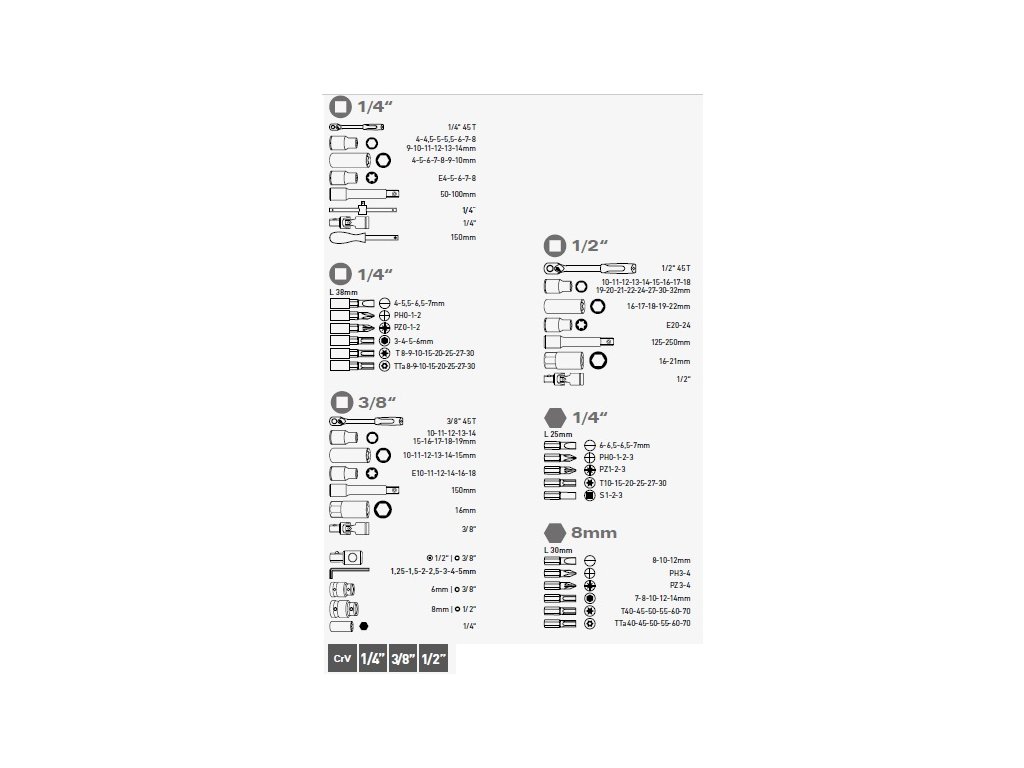Sada obsahuje: račňa 1/4" - 3/8" - 1/2" 45 zubov plastový kufor 1/4" nástrčné kľúče 4-4,5-5-5,5-6-7-8-9-10-11-12-13-14 mm 1/4" nástrčné kľúče predĺžené 4-5-6-7--8-9-10 mm 1/4" nástrčné kľúče b vnútorný TORX E4-5-6-7-8, 1/4" predlžovací nadstavec 50 mm a 100 mm 1/4" vratidlo 1/4" univerzálny kardan 1/4" skrutkovač 3/8" nástrčné kľúče 10-11-12-13-14-15-16-17-18-19 mm 3/8" nástrčné predlžené kľúče 10-11-12-13-14-15 mm 3/8" nastrčné kľúče vnútorný TORX E10-11-12-14-16-18 3/8" nastrčný kľúč na sviečky 18 mm 3/8" predlžovací nadstavec 150 mm 3/8" univerzálny kardan 1/2" nastrčné kľúče 10-11-12-13-14-15-16-17-18-19-20-21-22-24-27-30-32 mm 1/2" nastrčné kľúče predlžené 16-17-18-19-22 mm 1/2" nastrčné kľúče vnútorný TORX E20-24 1/2" nastrčný kľúč na sviečky 16-21 mm 1/2" predlžovací nadstavec 125 mm a 250 mm 1/2" univerzálny kardan adaptér 1/2" vonkajší štvorhran na 3/8" vnútorný štvorhran