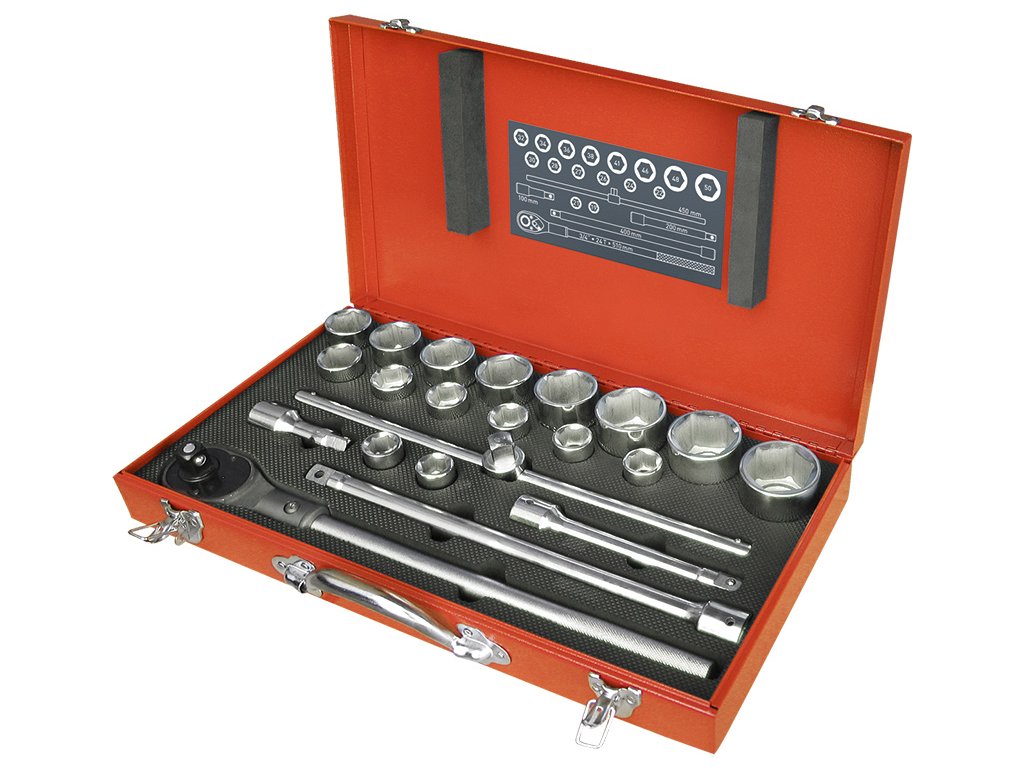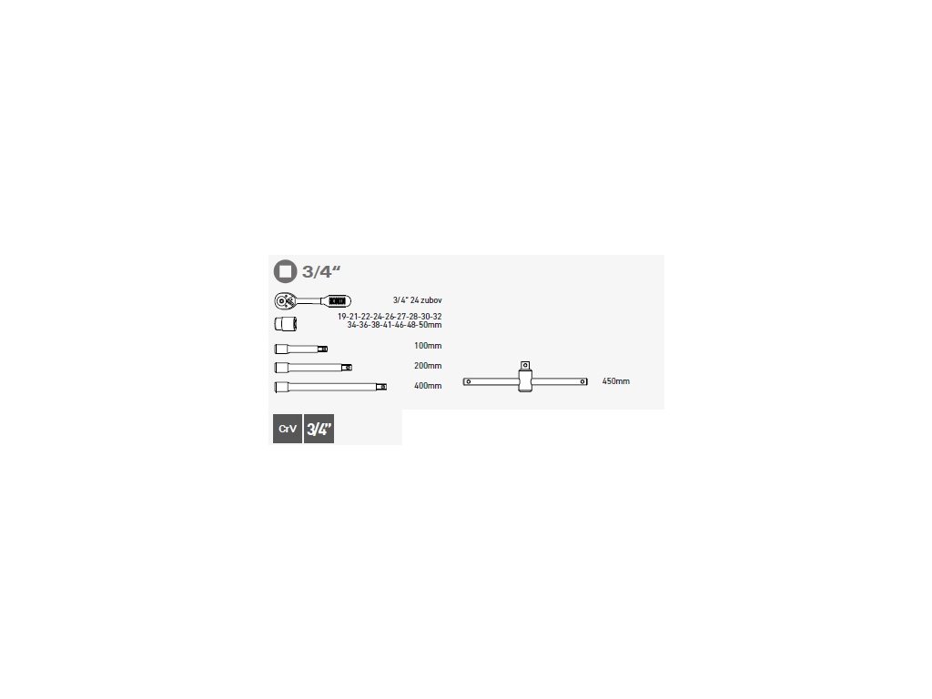 24 zubov, hlavice nástrčné: 3/4" 19-21-22-24-26-27-28-30-32-34-36-38-41-46-48-50mm, predlžovací nástavec: 3/4" 100-200-400mm, vratidlo: 3/4" 450mm,
