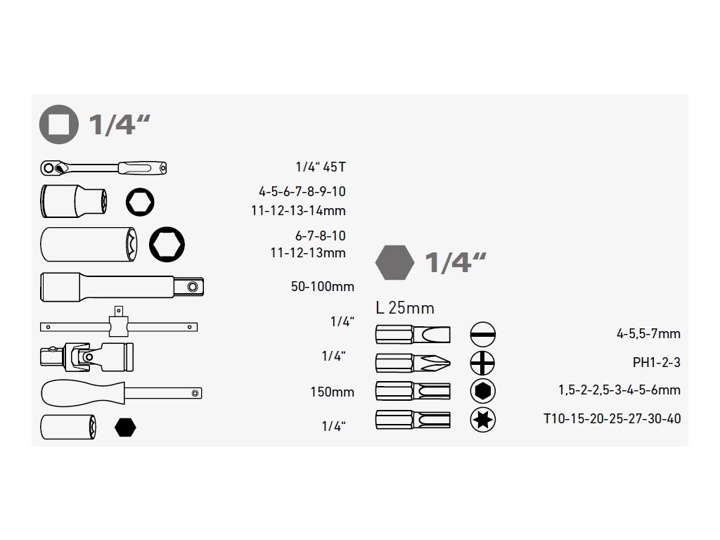 45-dielna gola sada 1/4" nástrčných kľúčov CrV, v kovovom kufríku.