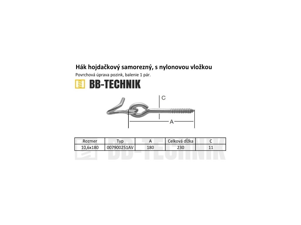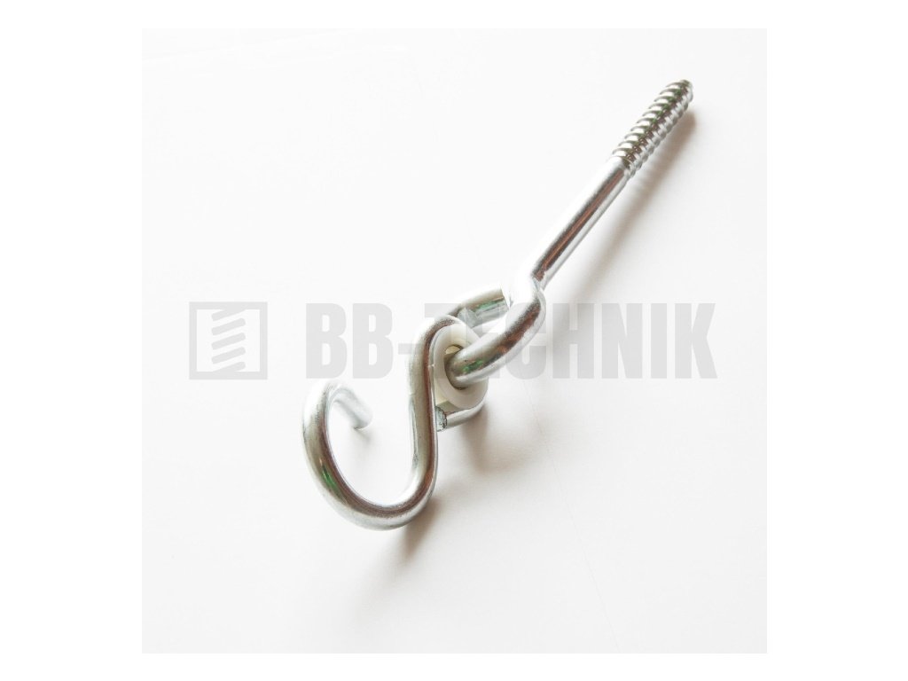 Hojdačkový hák so samorezným závitom má osadený prstenec z nylonu pre zníženie trenia a oderu karabiny pri hojdaní. Hák je určený na montáž priamo do dreva, alebo hmoždiny.