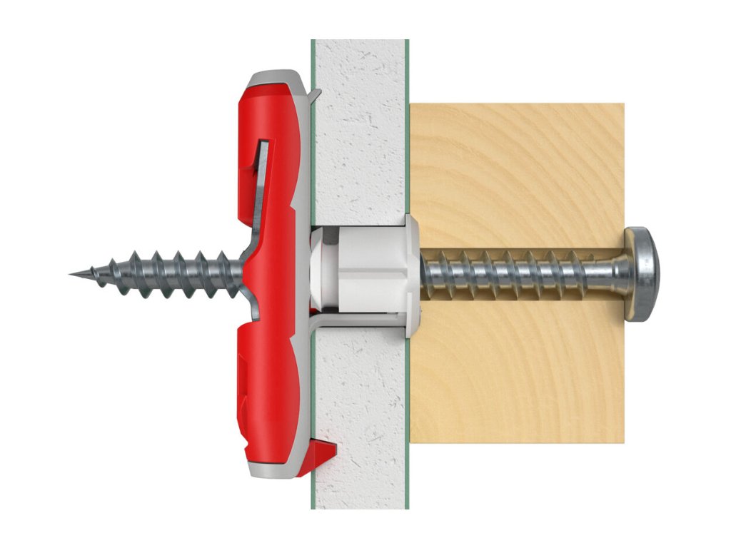 Hmoždiny Fischer DUOTEC sú inovatívne hmoždiny vyrobené z dvoch rôznych materiálov. Červená časť s tvrdeného nylonu roznáša zaťaženie rovnomerne na styčnej ploche, zatiaľ čo šedá mäkšia časť predchádza poškodeniu krehkého povrchu sadrokartónu, ktoré vedie ku jeho oslabeniu a strate únosnosti.