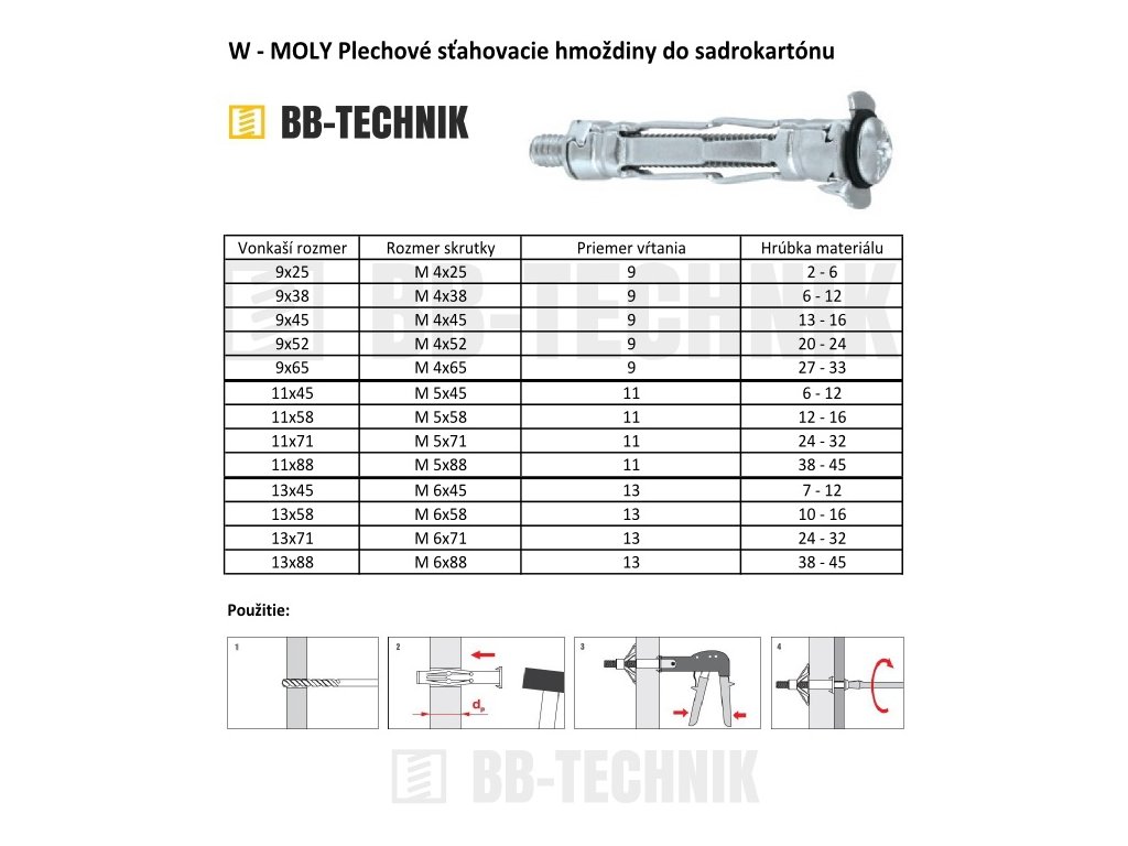 W MOLY 4x52 oceľová sťahovacia hmoždina do sadrokartónu