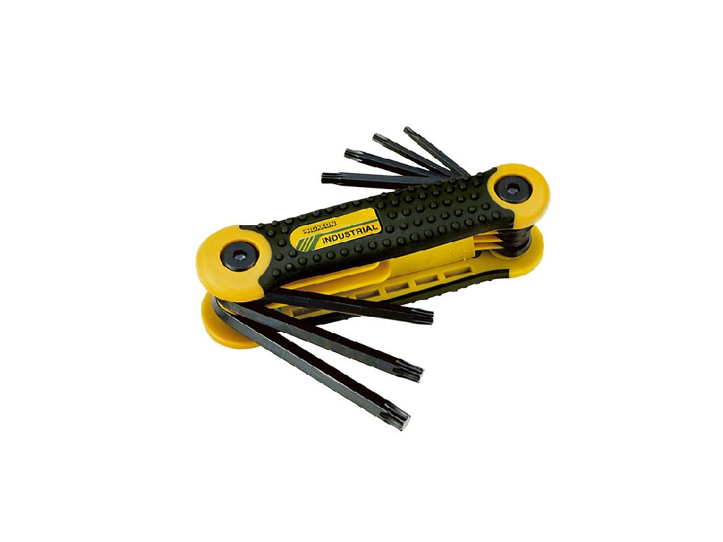Sada obsahuje rozmery kľúčov: TX 9 – 10 – 15 – 25 – 27 – 30 – 40. Chróm – molybdénová oceľ, galvanicky pokovovaná, v plastovom držiaku v tvare vreckového nožíka, ktorý slúži ako rukoväť.