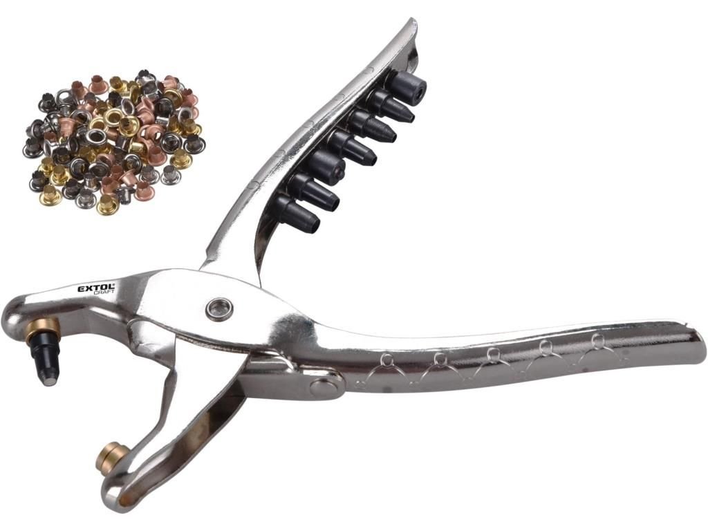 EXTOL dierovacie a nitovacie kliešte sú určené na strihanie otvorov 2,5, 3, 3,5, 4, 4,5, 5 mm a nitovanie kovových prechodiek. Balenie obsahuje aj 100 ks kovových očiek (25 ks strieborné, 25 ks zlaté, 25 ks medené, 25 ks čierne)