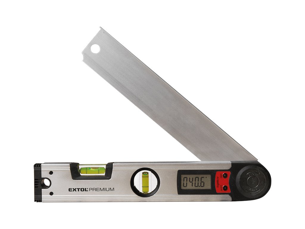 EXTOL Vodováha s digitálnym uhlomerom má dĺžku 305mm, 4-čiselný 4/8 LCD display, meranie v rozsahu 0°-225°, presnosť libiel ±0,5mm/1m, citlivosť uhlomera 0,1°, presnosť uhlomera ±0,3°, vodorovná a zvislá libela, funkcia automatického zapínania, hrúbka steny vodováhy 1,5mm.