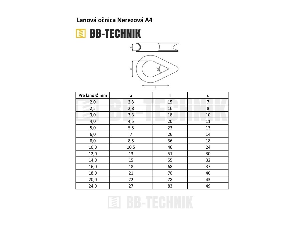 Nerezové lanové očnice sa používajú pri výrobe koncových očiek na oceľových lán a slúžia k spevneniu a ochrane lana proti zalomeniu. Nerez A4 je vhodná na použitie do agresívneho prostredia, napríklad v morskej vode.