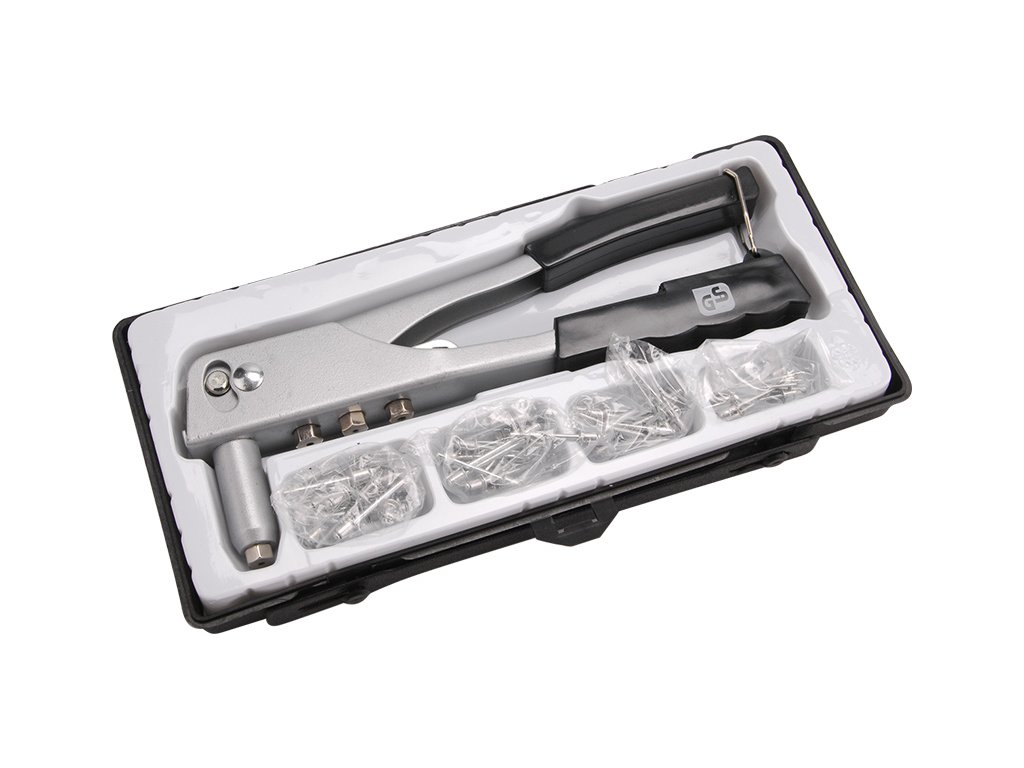 Oceľové nitovacie kliešte na nity priemeru 2,4-4,8 mm vrátane vzoriek nitov v púzdre.