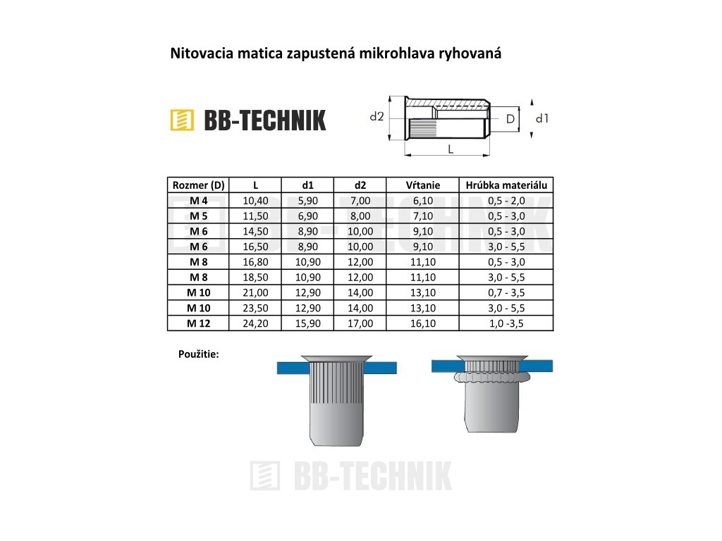 Nitovacie matice s mikrohlavou sa používajú na uchytenie metrického závitu do tenkostenných materiálov, resp. na vytvorenie závitovej vložky na tenkom materiály. Ryhované telo nitovacej matice zabezpečuje zvýšenú odolnosť voči pretočeniu matice.