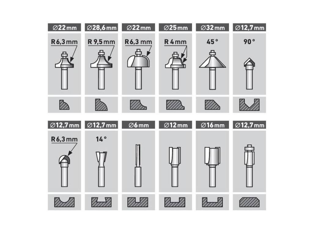 12 dielna sada tvarovaných frézok na drevo s 8 mm stopkou.