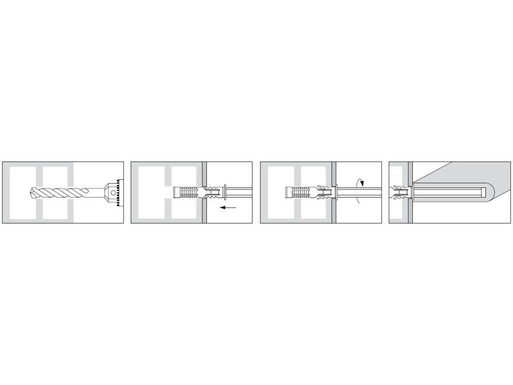 Držiaky na police s hmoždinou slúžia na neviditeľné uchytenie drevených políc. Držiak sa osadí do steny hmoždinou a na kovovú časť sa nasunie polica s predvŕtanými dierami.