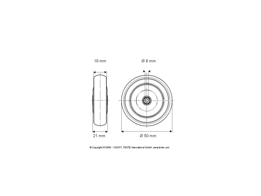 TENTE Koliesko prístrojové, 50x19 mm, otvor 8 mm, šedé, 50 kg