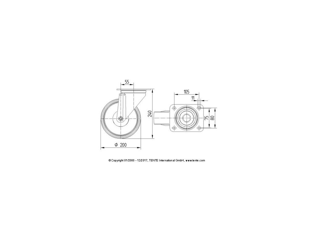 TENTE Koliesko transportné, 200x30 mm, otočné, platnička, čierne, 205 kg
