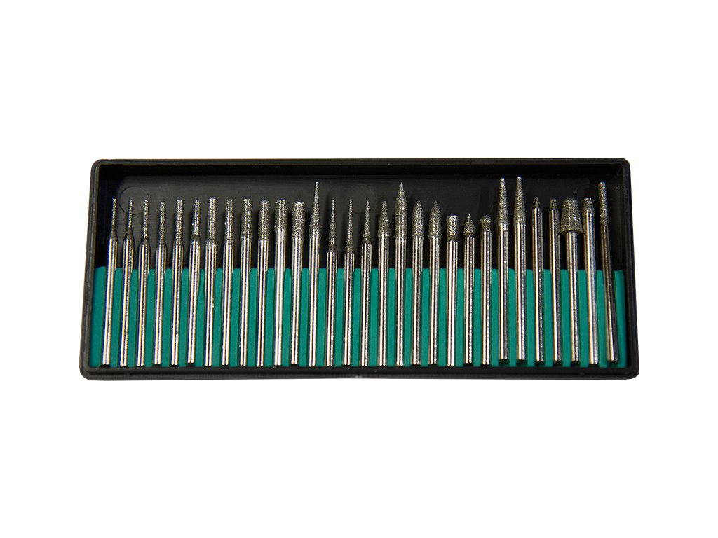 30 dielna sada diamantových rotačných nástavcov je určená na brúsenie a gravírovanie do malých plôch drevených, kovových