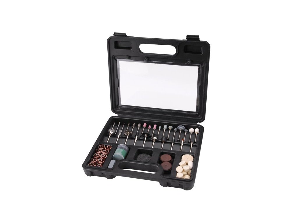 100 dielna sada rotačných brúsnych nástavcov so stopkou pr.3mm v plastovom kufríku.
