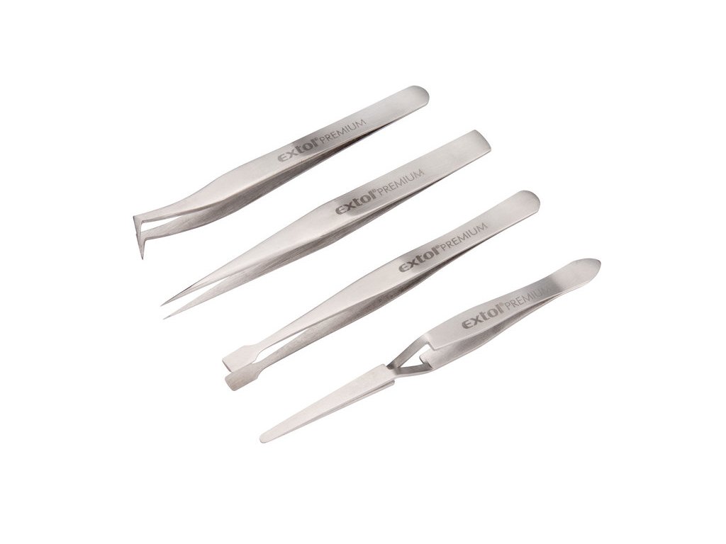4-dielna sada pinziet, pinzeta ihlová (126mm), plochá (118mm), krížová s oblým koncom (126mm), zahnutá s ostrou špičkou (113mm), z nerezovej ocele odolnej voči kyselinám.