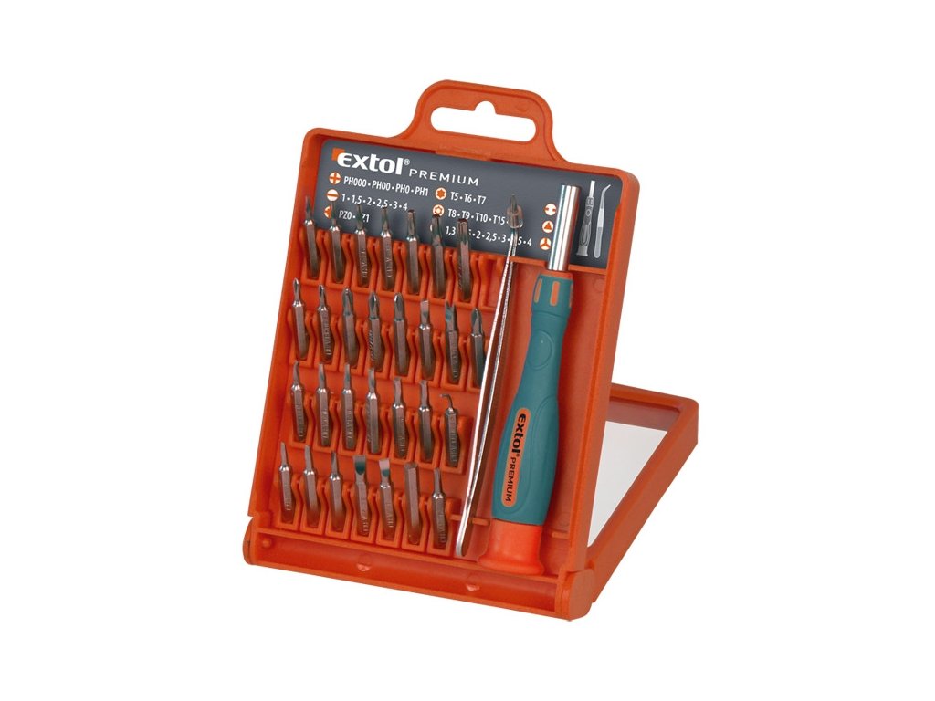 EXTOL 32-dielna sada, dĺžka skrutkovača 115mm, obsah sady: (-)1-1,5-2-2,5-3-4mm, (+)PH000-00-0-1, PZ0-1, (HEX)1,3-1,5-2-2,5-3-3,5-4mm, (TORX)T5-6-7, s dierkou T8-9-10-15-20, plochý s výrezom SD2,6,trojramenný TW3, trojuholník TA3, pinzeta. Bity z kvalitnej CrV ocele drží v skrutkovači silný magnet.