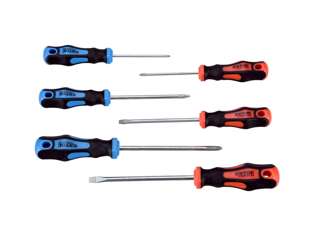 EXTOL 6-dielna sada mgnetických skrutkovačov, obsah sady: (-)3,5x75mm-5,5x100mm-6,5x125mm, (+)PH0x75mm-PH1x100mm-PH2x125mm