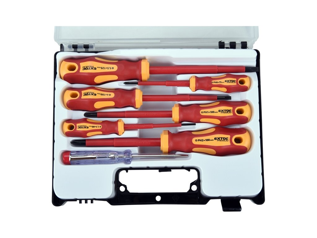 EXTOL 7-dielna sada elektrikárskych skrutkovačov, obsah sady: (-)2,5x80mm-4x100mm-5,5x125mm, (+)PH0x75mm-PH1x100mm-PH2x125mm, skúšačka 200-250V (-)3x65mm, plastový kufrík. Spĺňa normy IEC60900, JF-258, F-5001503. Ergonomicky tvarovaná rukoväť z tvrdého PP plastu, na povrchu mäkčená protisklzovou TPR gumou, pre zvýšenie krútiacej sily skrutkovača, driek z CrV ocele v matnej úprave.