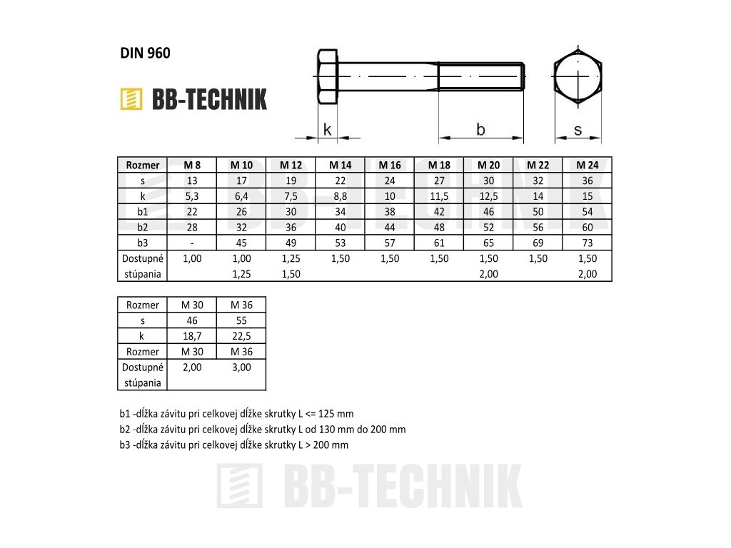 Kategória: | Skrutky so 6-hrannou hlavou s čiastočným závitom s jemným stúpaním DIN 960 |