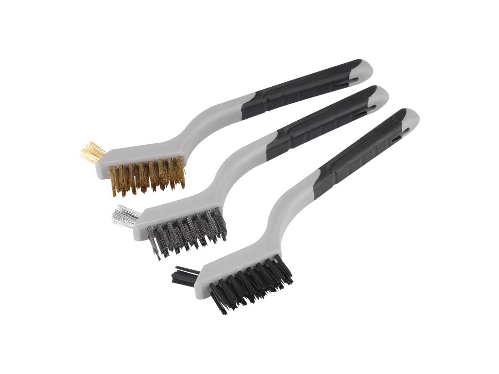Sada drôtených kefiek, 3-radové, celková dĺžka 180mm, dĺžka x výška osadenia 40x16mm, materiál nylon, antikoro, mosadz, plastová rukoväť z materiálov odolných voči rozpúšťadlám.