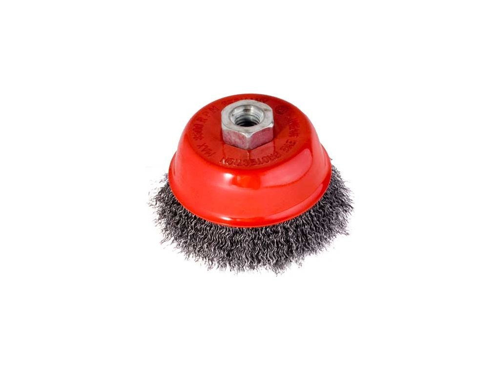 Hrnčekový oceľový kartáč s vlnitým drôtom do uhlovej brúsky.