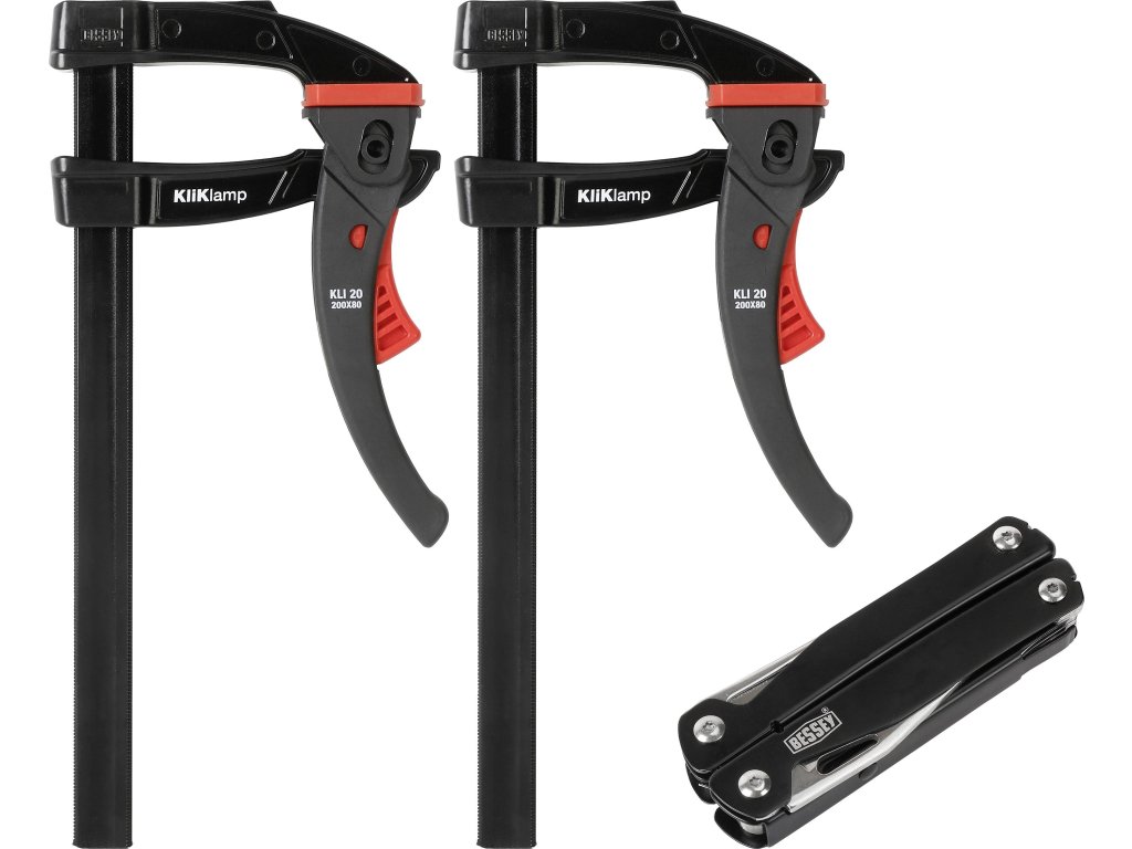 Sada 2x BESSEY svorka ľahká páková KliKlamp KLI 200x80 mm a multitool kliešte dodávané v púzdre.