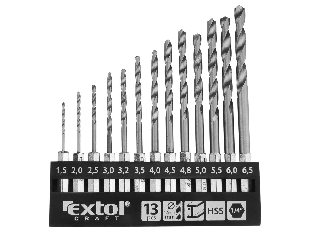 13-dielna EXTOL sada vrtákov HSS do kovu so 6-hrannou stopkou na rýchle uchytenie do uťahovačky alebo vŕtačky.