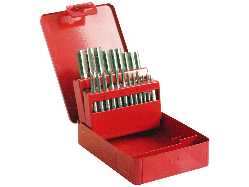 Ručné závitníky 21-dielna sada, M3-4-5-6-8-10-12. Závitníky aj závitové očká sú vyrobené z kvalitnej nástrojovej ocele a spĺňajú normy DIN 352. Závitníky sú uložené v kovovej kazete pre jednoduchú manipuláciu a skladovanie.